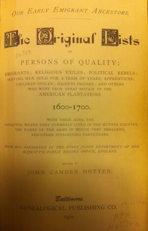 [edit]The above story is corroborated by a book named "The Original Lists Of Persons of Quality; Emigrants; Emigrants; Religious Exiles; Political Rebels; Serving Men Sold For a Term of Years; Apprentices; Children Stolen; Maidens Pressed; And Others Who Went From Great Britain To The American Plantations. 1600 - 1700." On page 336, it confirms that John Chilcott was delivered to Ann Gallop in 1685 (p.336)[7]