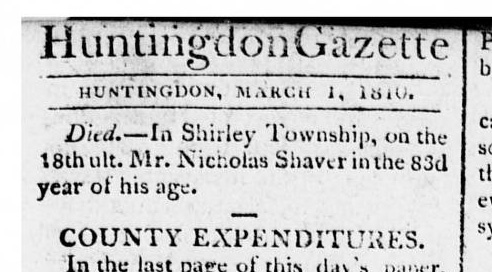 - ↑ Huntingdon Gazette Newspaper, 1 Mar 1810; Notice reads: Died. - In Shirley Township, on the 18th ult. Mr. Nicholas Shaver in the 83d year of his age.
