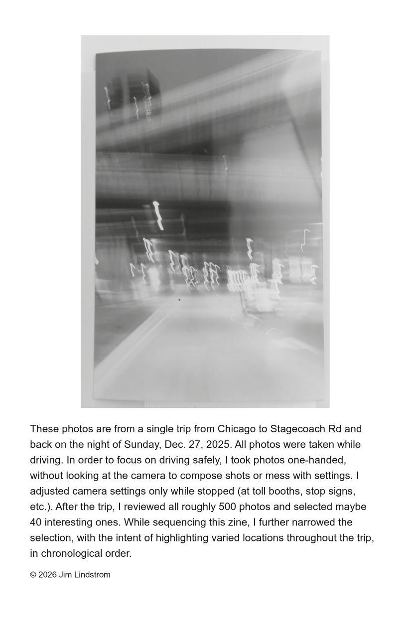 This photo zine documents a single trip from Chicago to Stagecoach Rd and back, in chronological order.