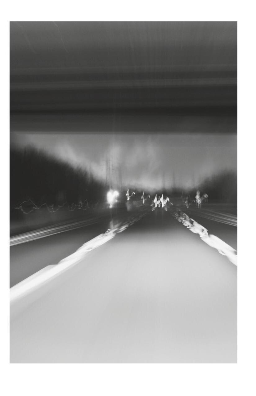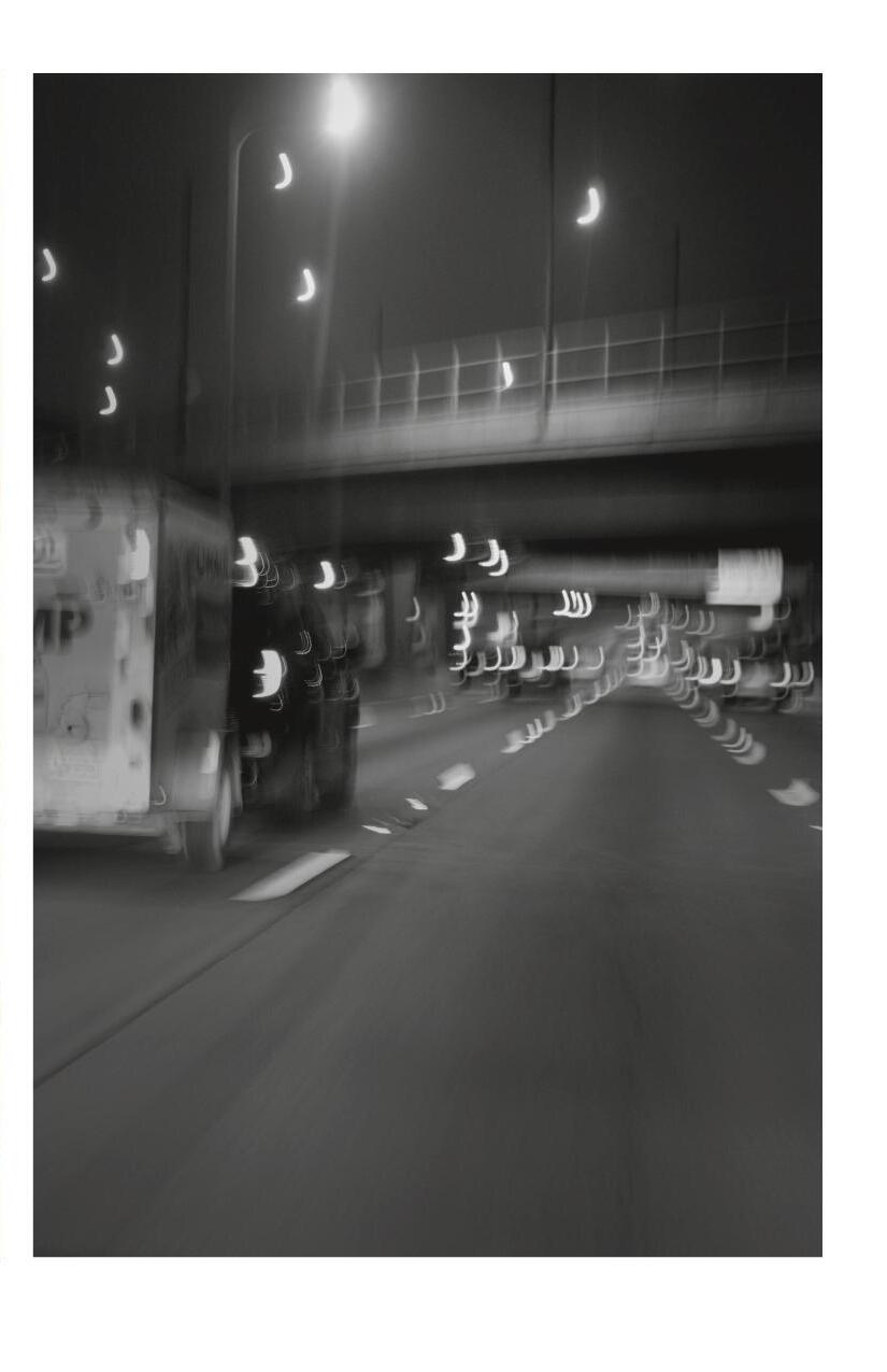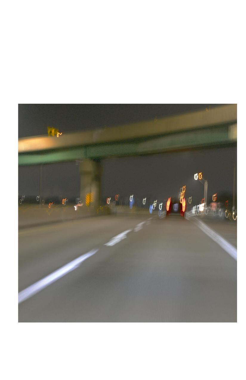 All shots were taken while driving and thus have a highly stylized look consisting of dreamy blur and jittery highlights that dance in chaotic shapes.