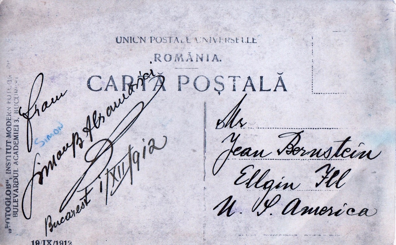 Back side of a postcard sent by Simon Abramovici to Jean Bernstein in 1912. From the files of Beatrice Bernstein, shared by daughter Rachael Friedman.