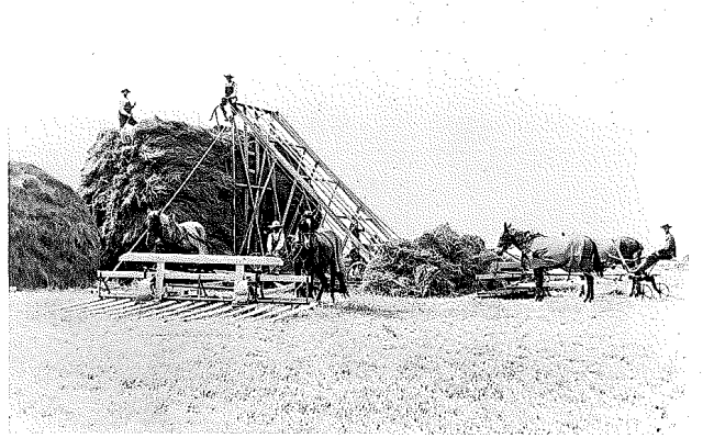 From Lindstrom Book, "Stacking Alfalfa, the wind blowing a gale from the South the Temperature near 100, Elmer and Clarence driving the two sweeps, Dad in the stack, John Eckholm sitting on the stacker, I am on the other side driving the stacker team."
