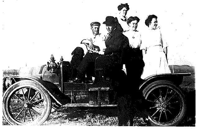 From Lindstrom Book: "August Lindstrom in his Two cylinder Maxwell Roadster, left-to-right: August, John E. Carlson, Tekla Rosenquist, Anna Carlson Lindstrom, and Manda Rosenquist. Picture taken after August and Anna were married Nov 12, 1912."