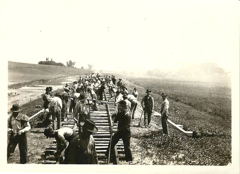 Emailed from Dennis Linn on 1/9/2014. He says, "this is a pic of the construction of the railroad on Dad's (Les Linn's) farm. The concrete structure in the back on the right is that old concrete culvert that had all the Linn names carved into it. Do you remember a similar pic to this one that hung on the south side of the little hallway on the main floor - just across from the upstairs door? I think Robert has that one."