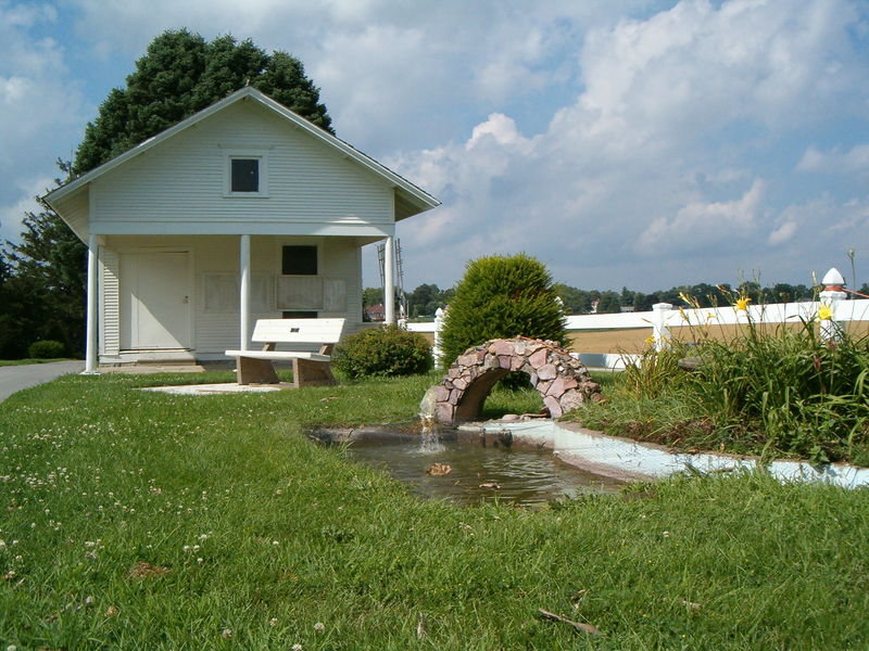 Photo of Shelby Township Cemetery entrance pond, bench & office