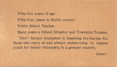 Frank's card says he is 54 years old, which would have been true between June 1927 and June 1928. This coincides with the election for the 43rd session of the Iowa General Assembly (1928-1930). The incumbent who represented Pottawatamie County in the 42nd and beat Frank to remain representative in the 43rd session was H.M. Greene (p. 238):