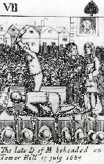 "Upon the death of [King Charles II] on Feb. 6, 1685 the Catholic Duke of York (brother of deceased King) acceded to power as [King James II]. Monmouth landed at Lyme Regis. Dorset with eighty-two followers in June and quickly raised over 4,000 additional men. On July 6, 1685 Monmouth's Army was completely defeated on the Plain of Sedgemoor, Somerset. The Duke fled but was soon caught and beheaded.