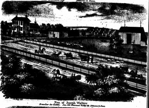 Joseph Walker, a farmer and stock-raiser of Pleasant Valley township, post-office, Iowa City; was born September 19, 1819, in Portage County, Ohio; came to Iowa and settled on Buck Creek, in Pleasant Valley Township, September 1, 1837, and took up first claim on Bear Creek, the farm upon which he now resides, of 320 acres. His brothers Samuel and James, took up claims near him, and lived upon them for eight or ten years. He was married June 25, 1850, to Miss Jane Powelson, of Washington County, Iowa. They have five children: Mary, Henry A., Joseph L., Callie, Emma. He is a member of the Universalist Church at Iowa City, and a republican in politics, and voted against the prohibitory amendment; has held several township offices, trustee and school director. He is a stockholder in the Johnson County Savings Bank, and one of its directors. He is one of the Johnson County farmers who have made a success in life, and accumulated a sufficient amount of worldly goods to live comfortably.